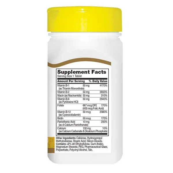 • حاوی مجموعه‌ای از ویتامین‌های B: این ترکیب شامل تیامین (B1)، ریبوفلاوین (B2)، نیاسین (B3)، ویتامین B6، اسید فولیک، ویتامین B12، بیوتین (B7)، اسید پانتوتنیک (B5) و کلسیم است.